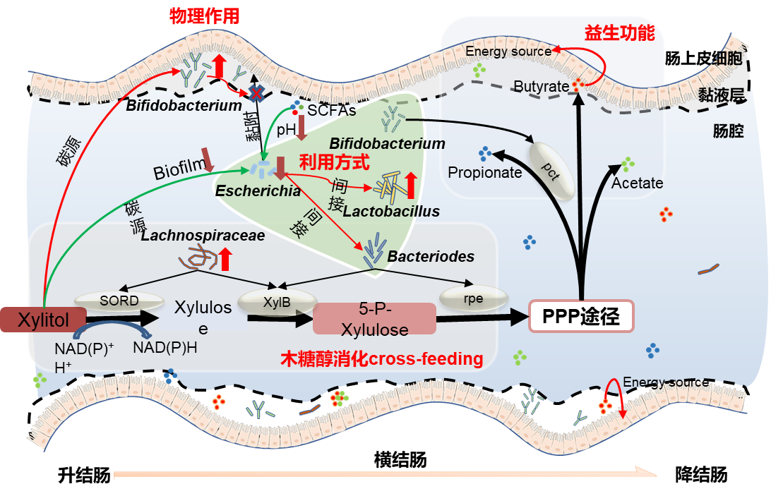 木糖醇,甜度与蔗糖类似,甜感好,是最受欢迎的糖替代品之一。以往关于木糖醇的研究主要集中在口腔微生物,大量未被吸收的木糖醇如何被微生物利用机制尚不清楚,此外,很少有涉及木糖醇对于肠道微生物消化过程中的关键酶表达、菌落丰度及短链脂肪酸(SCFAs)的产生的系统性关联分析。