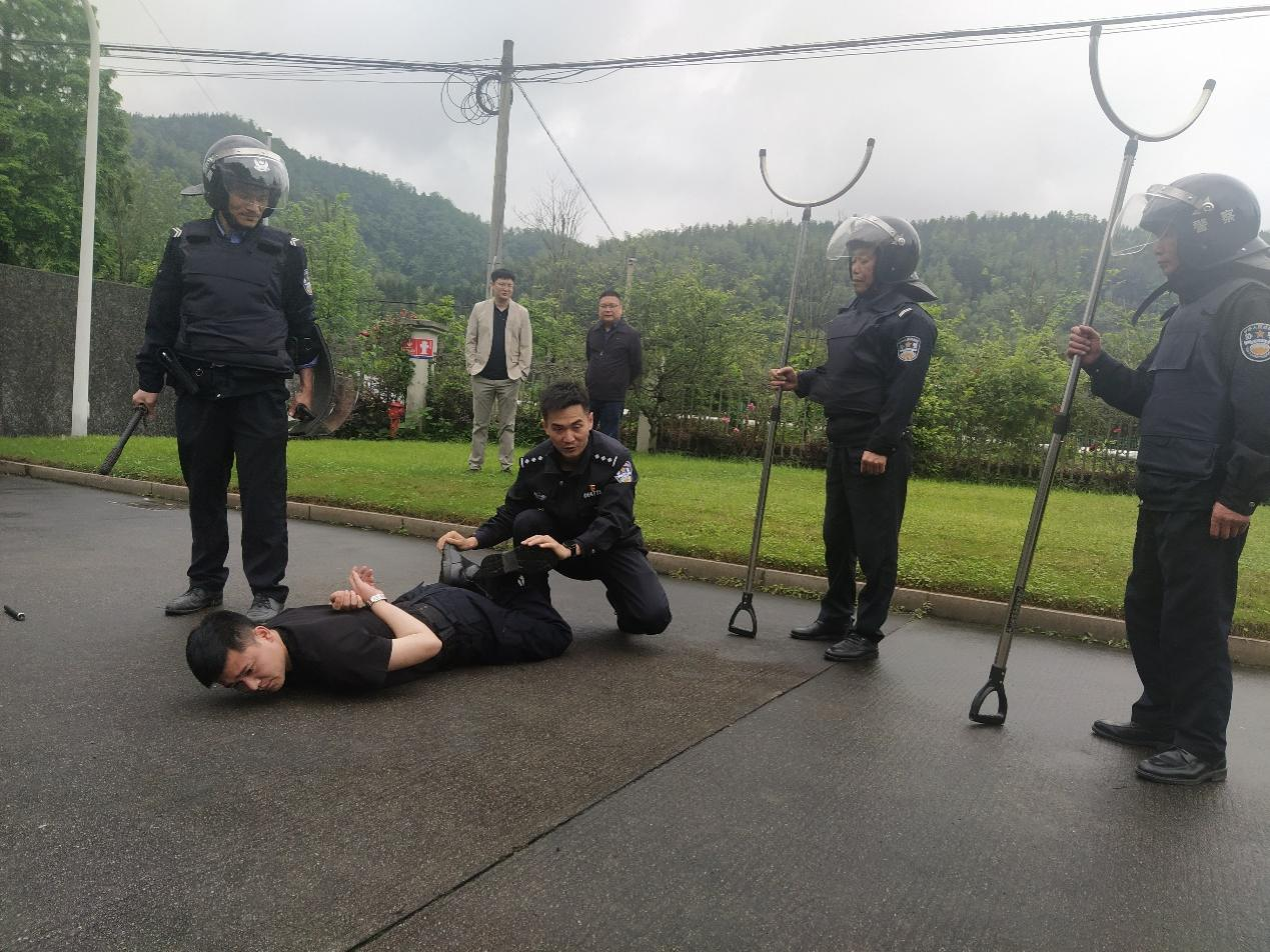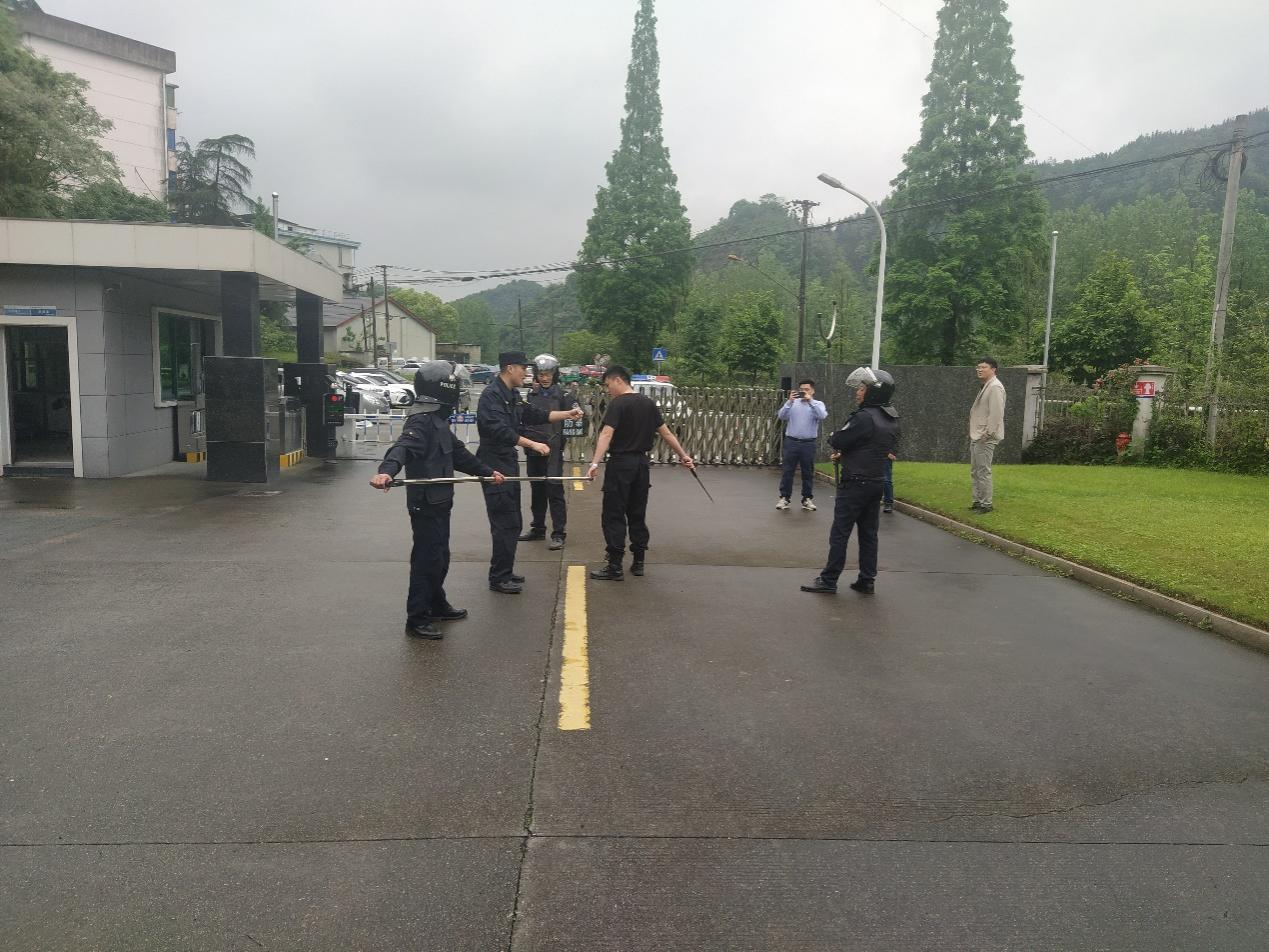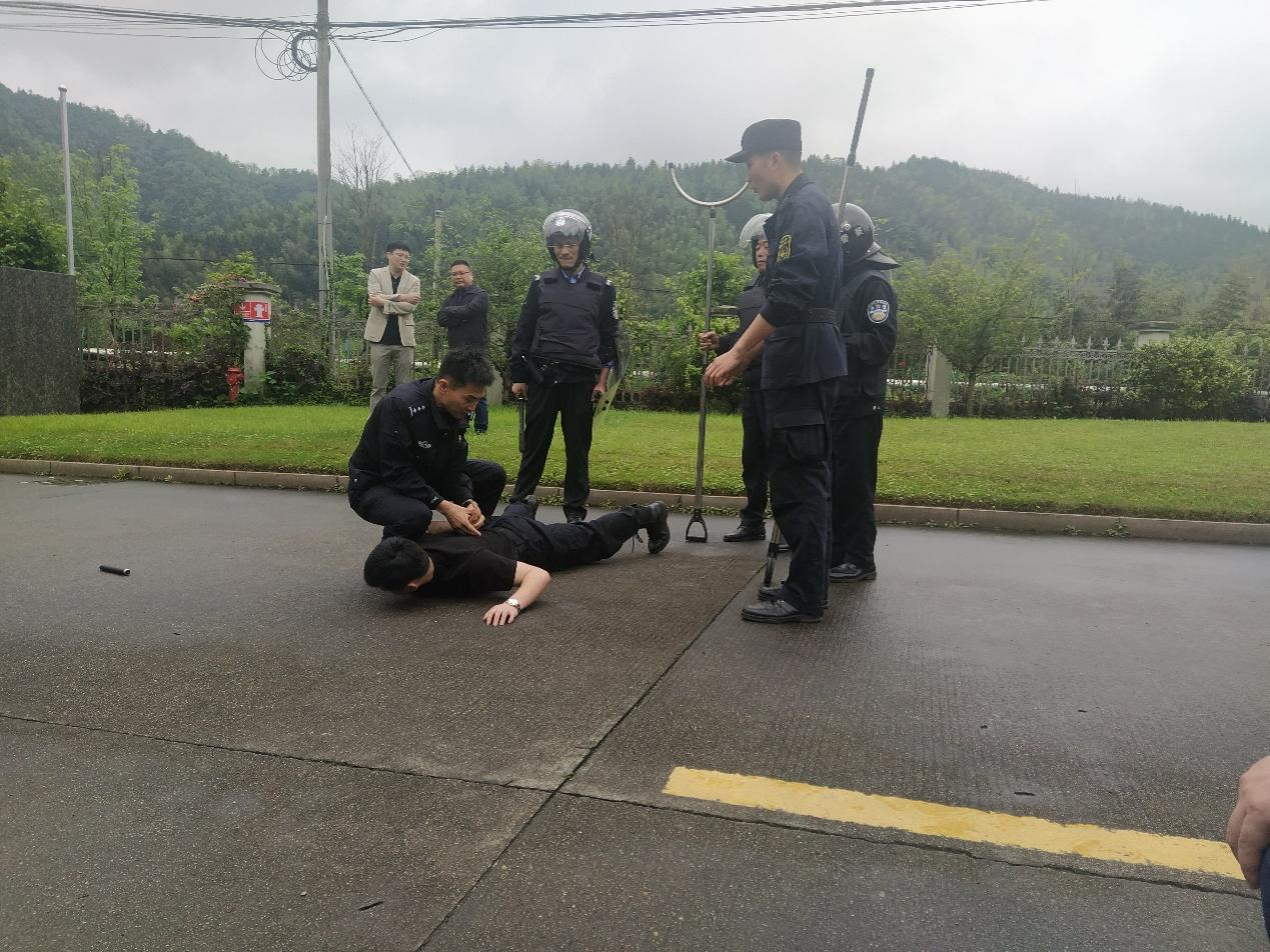 演练背景:本次演练模拟场景公司1号门岗有一名暴恐分子因私人纠纷,寻找办公楼内XX部XX员工,现场门岗发现该名人员异样后情绪激动且携带刀具,当即报警并向安全环保部与其他门岗汇报情况,各岗位接到汇报后,安环部宣布启动反恐防暴应急工作预案,各岗位工作人员立即响应,应急处置行动组、通信联络组、保障支援组赶到现场,对暴恐分子进行打压和控制,对事故现场进行隔离,最后,由华埠镇派出所干警将暴恐分子押送上警车。