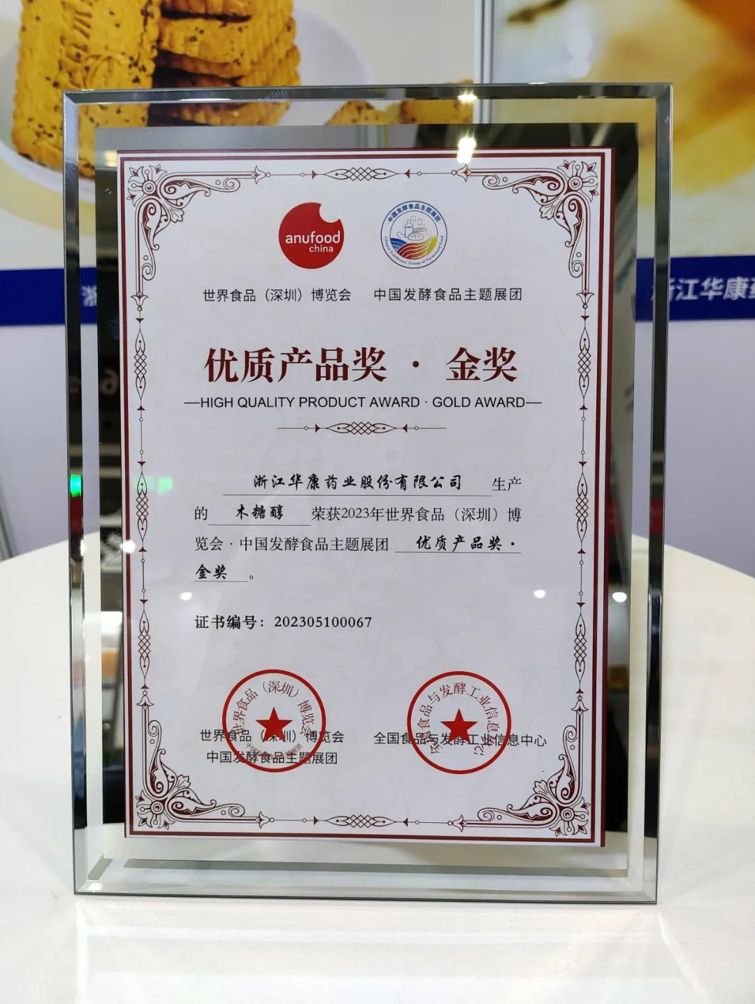 华康木糖醇荣获2023年世界食品 (深圳)博览会.中国发酵食品主题展团优质产品金奖